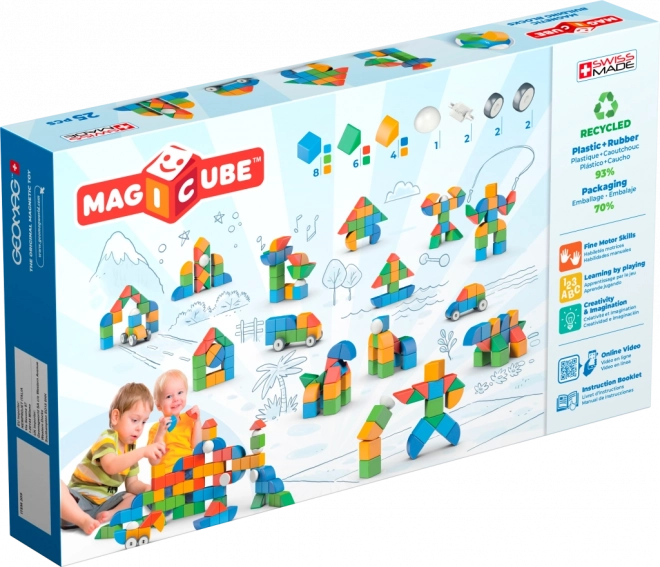 GEOMAG MAGICUBE SHAPES pakub alates 1. eluaastast lastele nutikat meelelahutust magnetkuubikute ja kujunditega, mis haakuvad üksteise külge lihtsalt ja turvaliselt. Komplekt sisaldab 25 tükki, sh rattaid, nii et väikesed ehitajad saavad luua mitte ainult torne ja maju, vaid ka lihtsaid sõidukeid ja liikuvaid mudeleid. Värvilahendus toetab värvide ja kujundite äratundmist, peenmotoorikat ning ruumilist kujutlusvõimet.