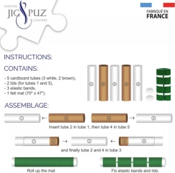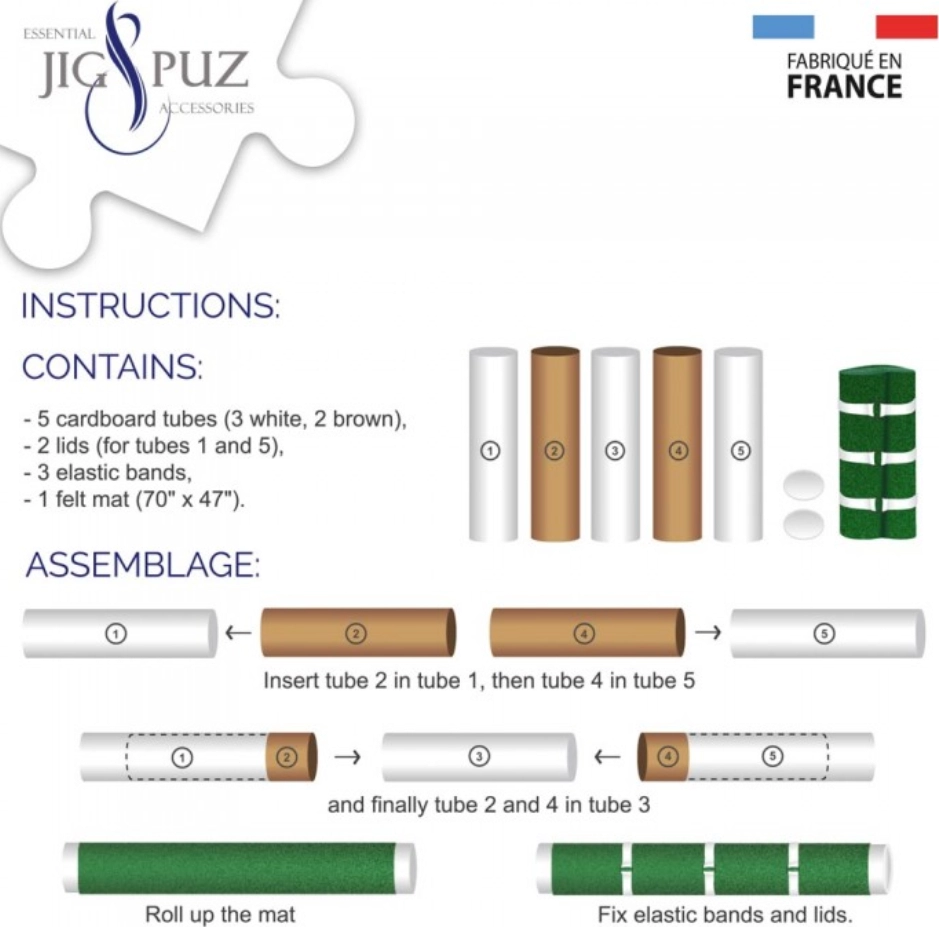 Komplektis on kõik vajalik: tugevaks südamikuks papptorud, vildist matt mõõdus 180 × 120 cm, plastkaaned ja kinnitusrihmad. Tänu suurele mõõdule on matil piisavalt ruumi ka mugavaks tükkide sorteerimiseks kuju ja värvi järgi, mis kiirendab ning muudab kokkupaneku nauditavamaks.
