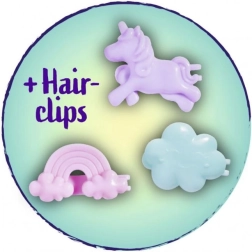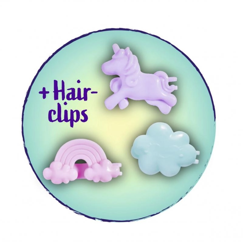 Evil on pikad roosad juuksed ja värvilised klambrid pilve, vikerkaare ja ükssarviku kujuga lõputute soengute loomiseks.