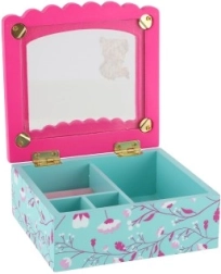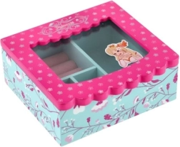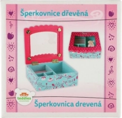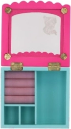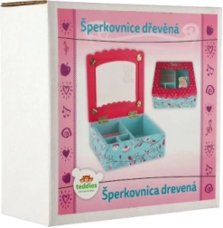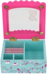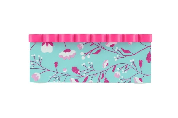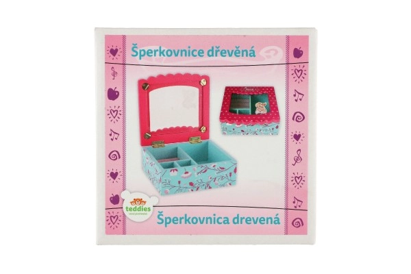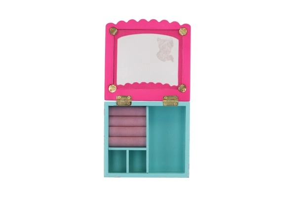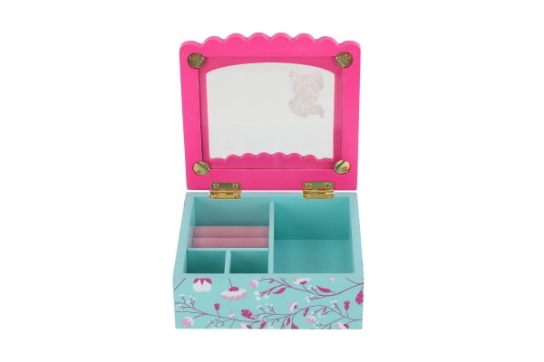 See dekoratiivne kvaliteetsest puidust ehetekarp on suurepärane lahendus sõrmuste, kõrvarõngaste ja väikeste aardete korrastatud hoiustamiseks. Roosa kaas klaasja/läbipaistva osaga ning sisemine peegel teevad aksessuaaride kiire valimise lihtsaks, samal ajal kui türkiissinine põhi õrna lillemustriga lisab interjöörile võluva aktsendi.