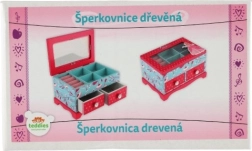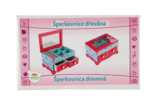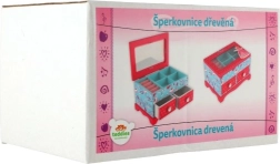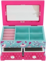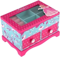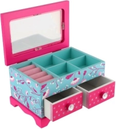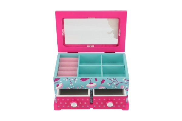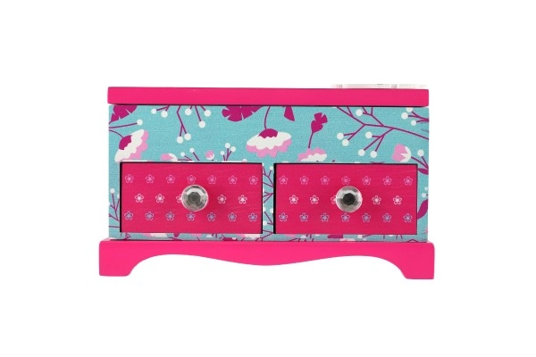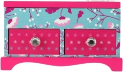 Elegantne laste ehetekarp kvaliteetsest puidust, millel on ülesklapitav kaas ja kaks sahtlit – ideaalne ehete ja pisikeste aardete hoiustamiseks. Silmapaistev on värviküllane disain lille- ja linnumotiividega roosa-sinises koosluses ning kaunistus printsessi motiiviga. Praktiline sisemine jaotus ja integreeritud peegel teevad igapäevase kasutamise lastetoas mugavaks.
