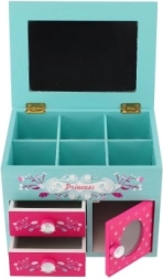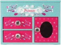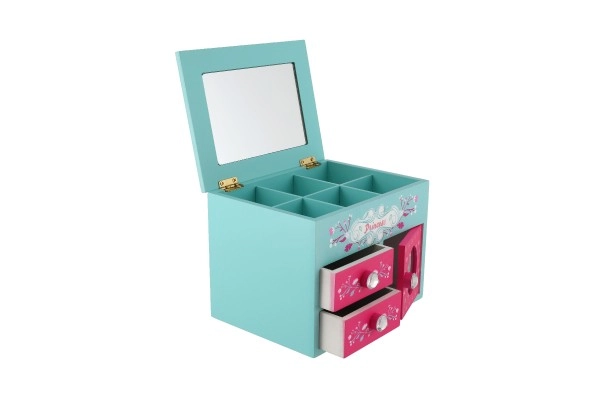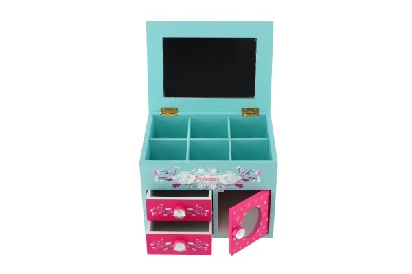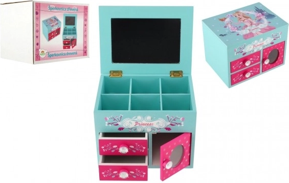 See armas puidust ehetekarp türkiissinise-roosa kujundusega, printsessi ja lillede motiividega, on suurepärane lahendus sõrmuste, kõrvarõngaste, käevõrude ja väikeste saladuste korrastamiseks. Ülesklapitava peegliga kaane all on jaotatud lahtrid igapäevaseks ülevaateks ja kiireks valikuks.
