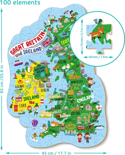 Avasta saarte võlu hariva puslega, mis tutvustab lõbusal viisil Suurbritannia ja Põhja‑Iirimaa geograafiat. Sobib nii lastele kui täiskasvanutele, ingliskeelsete kirjeldustega keeleharjutuseks ja teadmiste arendamiseks. Valmis pusle mõõt on ligikaudu 65 × 45 cm ja see sisaldab 100 tükki mõnusaks pereajaks.