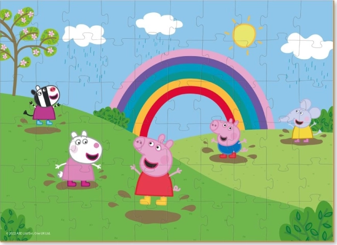 Avasta värvikas seiklus puslega Peppa Põrsas: Vikerkaarerõõmud. 60 vastupidava tükiga on kokkupanek lõbus tegevus lastele, kes harjutavad mängides keskendumist ja kujutlusvõimet. Valminud pilt mõõtudega 32 × 23 cm sobib hästi laste tuppa väljapanekuks.