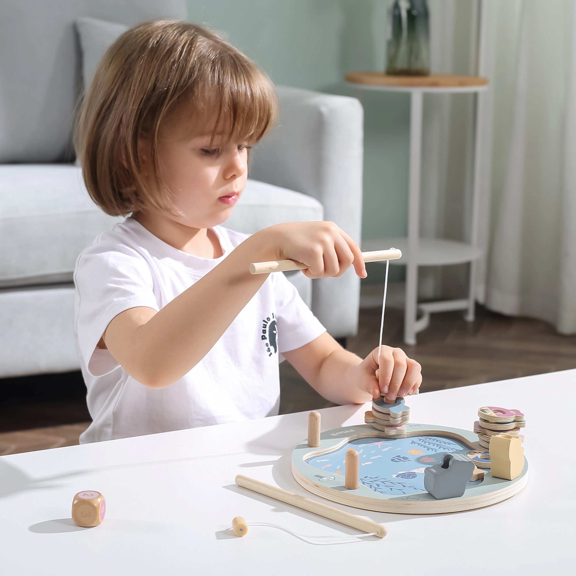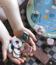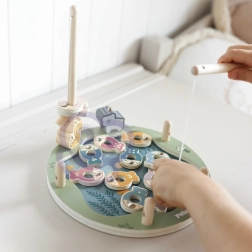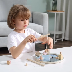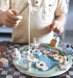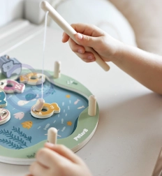Puidust magnetiline kalapüügimäng on suurepärane valik esimesteks seltskonnamängudeks. Värvilisi, nummerdatud ja täppidega kalakesi püütakse magnetõngeritvadega, mis aitab lõbusal moel harjutada loendamist, keskendumist ja kannatlikkust. Täring lisab mängu juhuslikkust ja põnevust – võidab see, kes püüab õige kala.