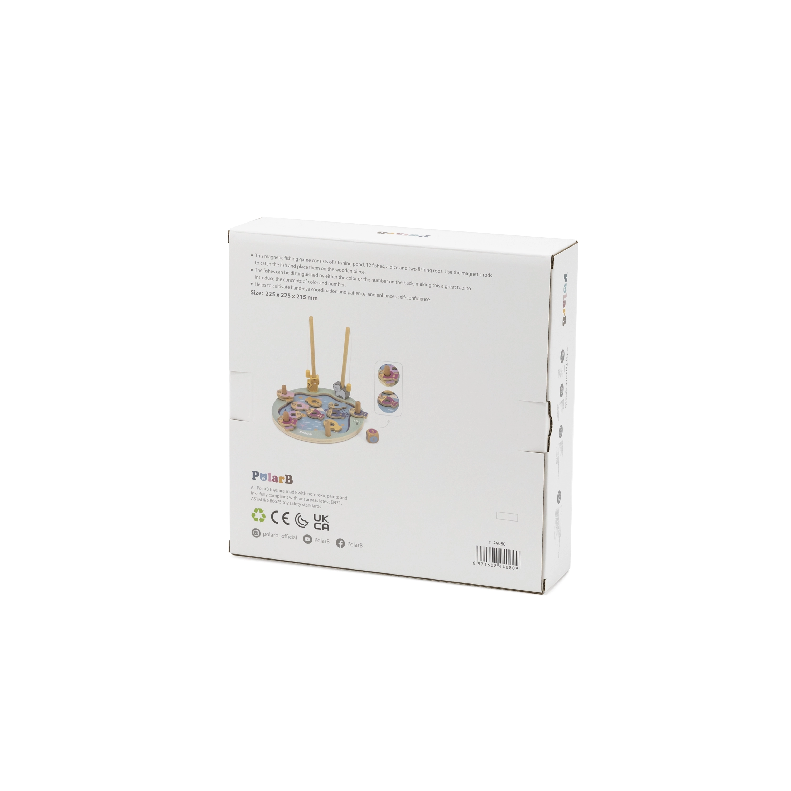 Lõbus VIGA POLARB puidust magnetiline kalapüügimäng pakub alates 18. elukuust värvikat kalapüüki numbrite ja täppidega. Komplektis on ümmargune alus, 2 õngeritva, täring ja 12 kala. Mäng arendab käe-silma koordinatsiooni, peenmotoorikat, numbrite õppimist ja sotsiaalset suhtlust nii võisteldes kui ka koostööd tehes.