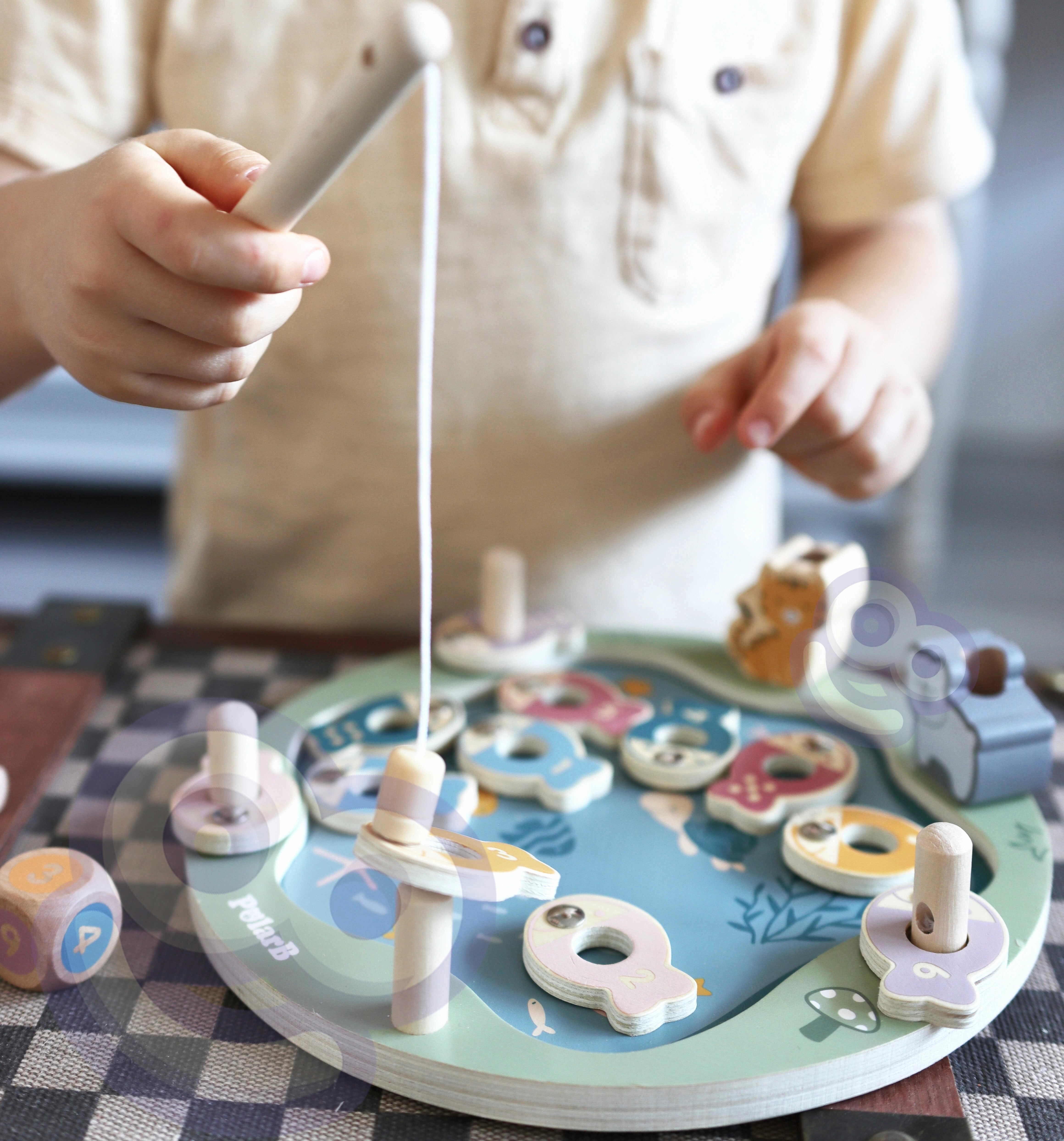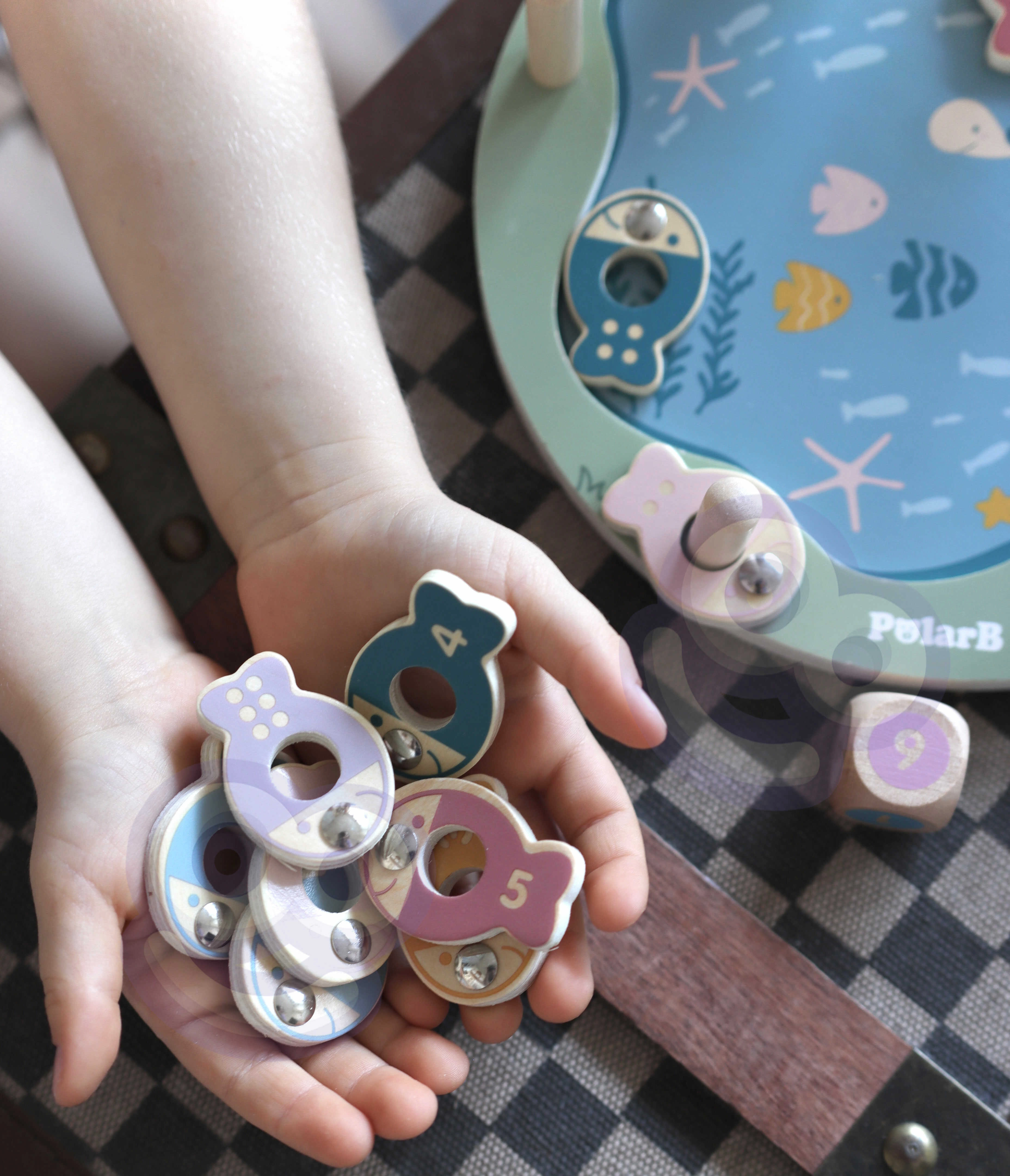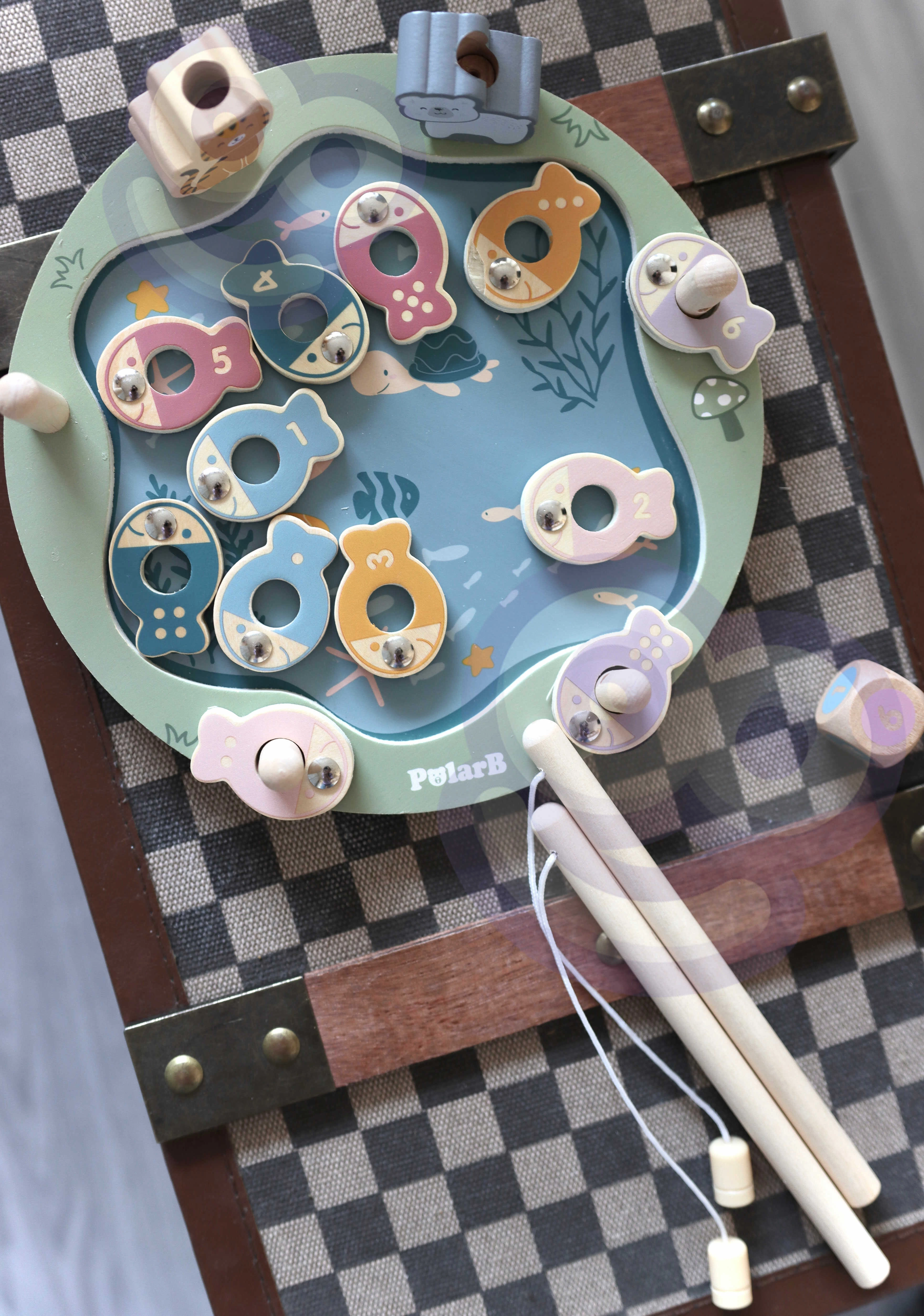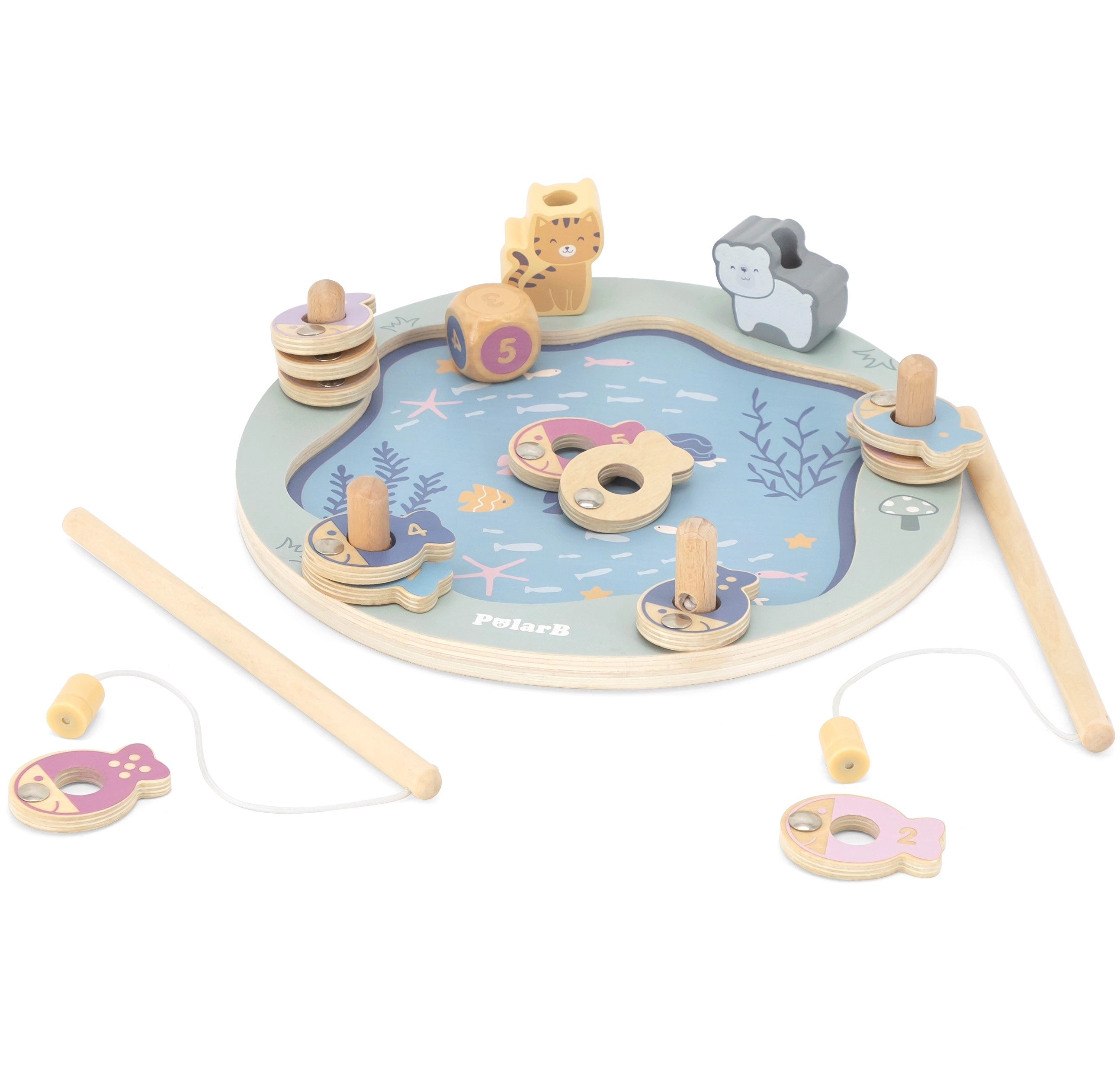 - Komplektis: puidust alus, 2 magnetilist õngeritva, täring, 12 kala numbrite/täppidega