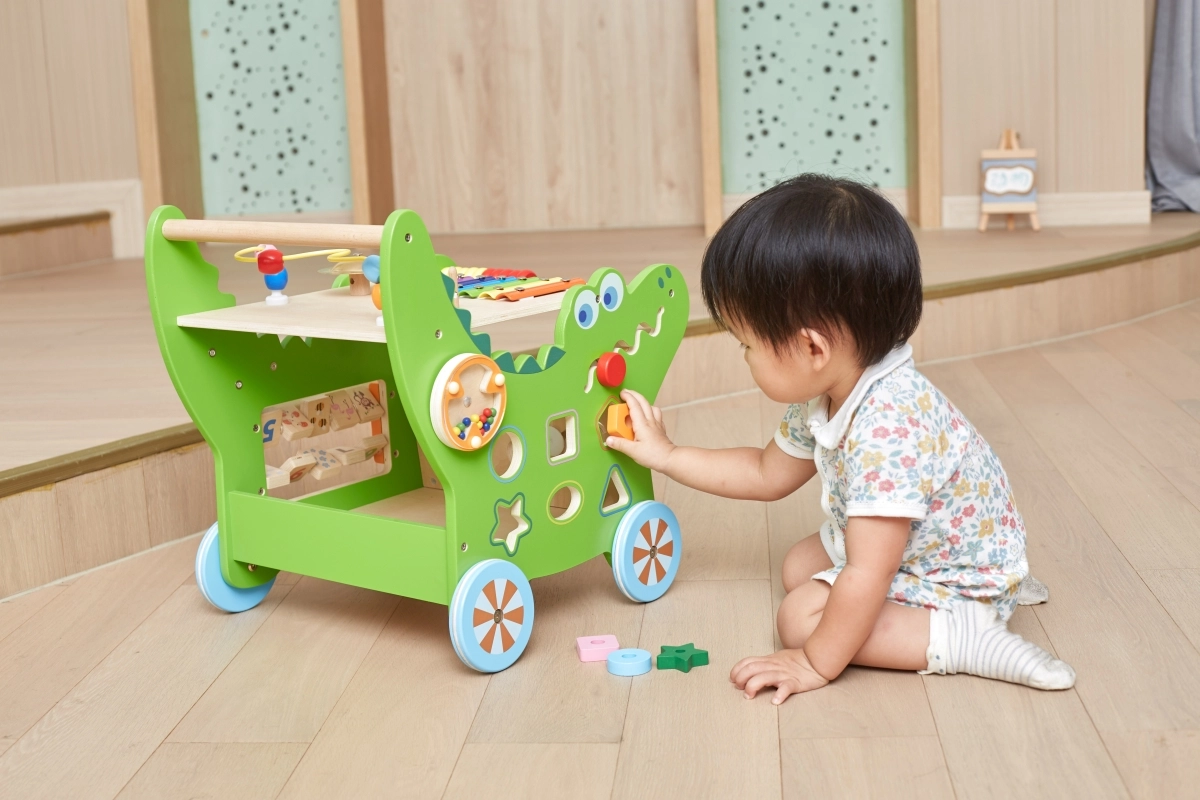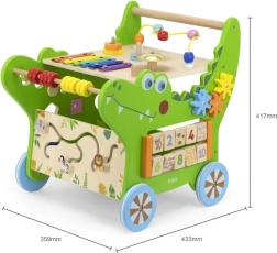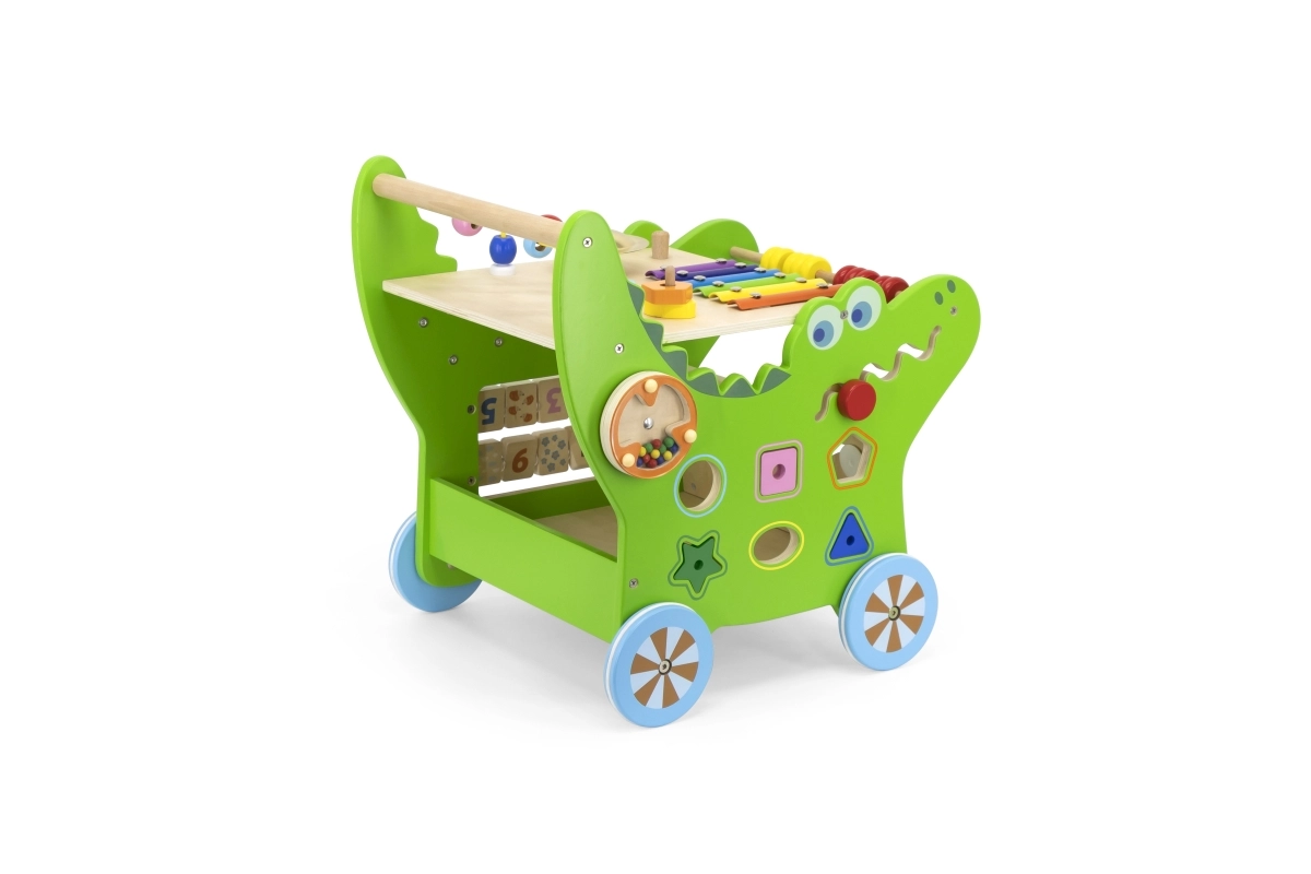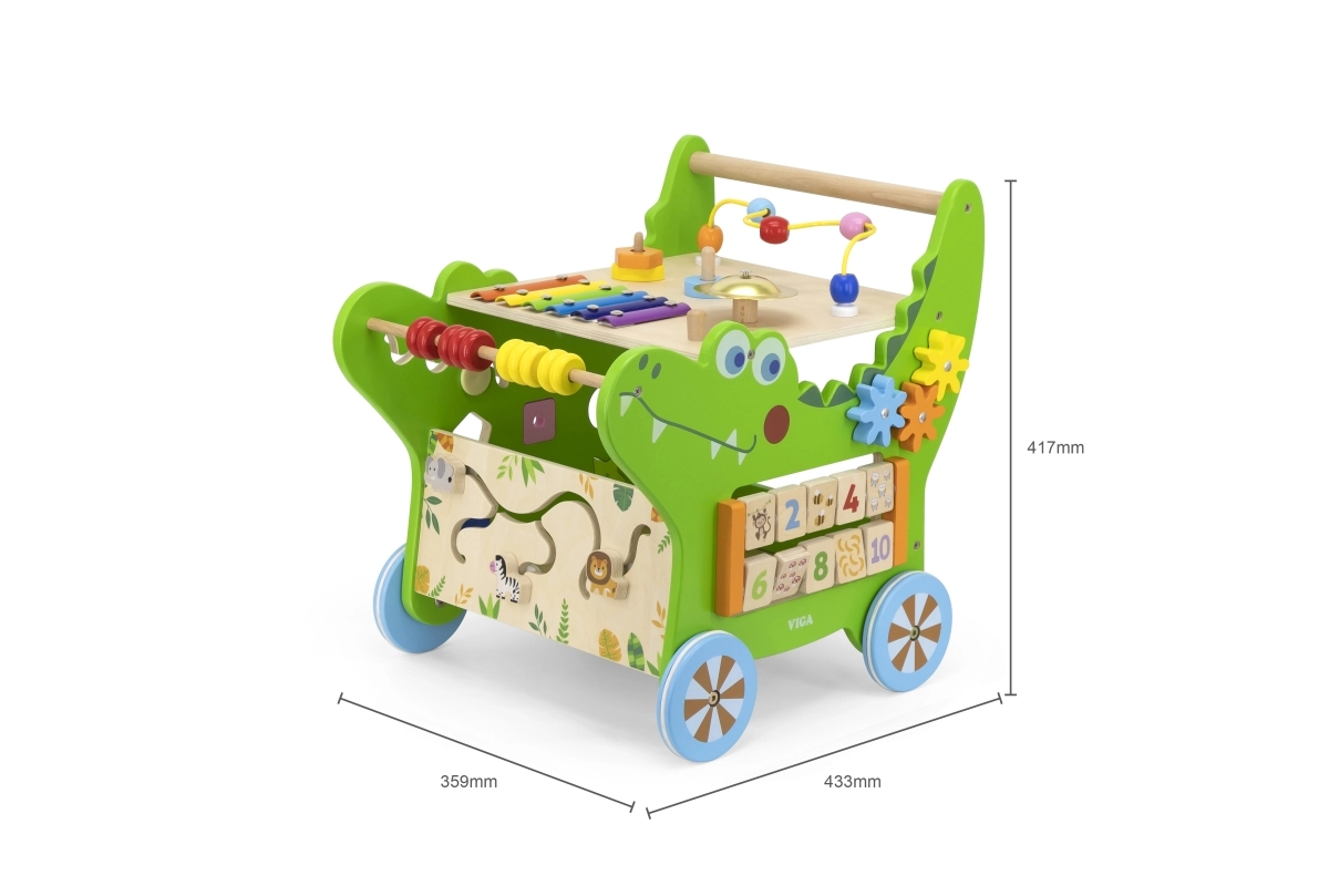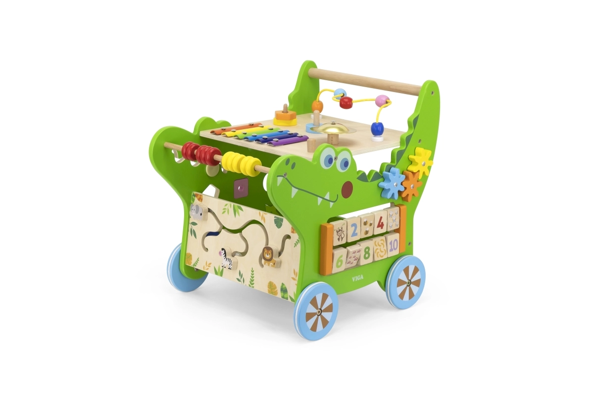 Avastage VIGA mitmefunktsionaalne puidust krokodillikujuline kõndimisabi, mis pakub kuni 12 tegevust mänguks ja õppimiseks. Toetab esimesi samme, arendab peen- ja üldmotoorikat, silma–käe koordinatsiooni ning loogilist mõtlemist. Sellel on ksülofon, arvutuskepid/loendaja, kujude sorteerimiskast, hammasrattad, labürint ja muud elemendid, mis julgustavad lapsi liikuma ja avastama.