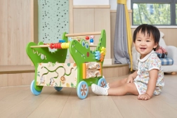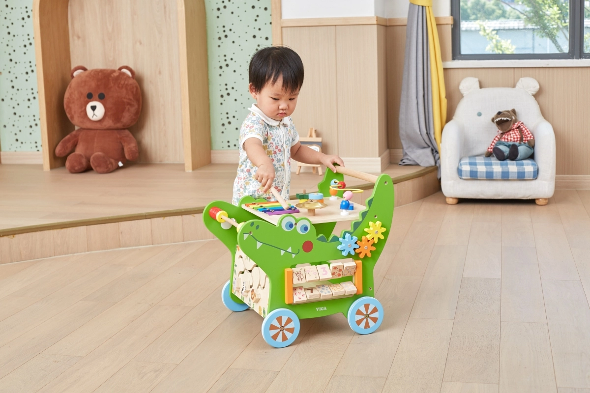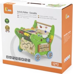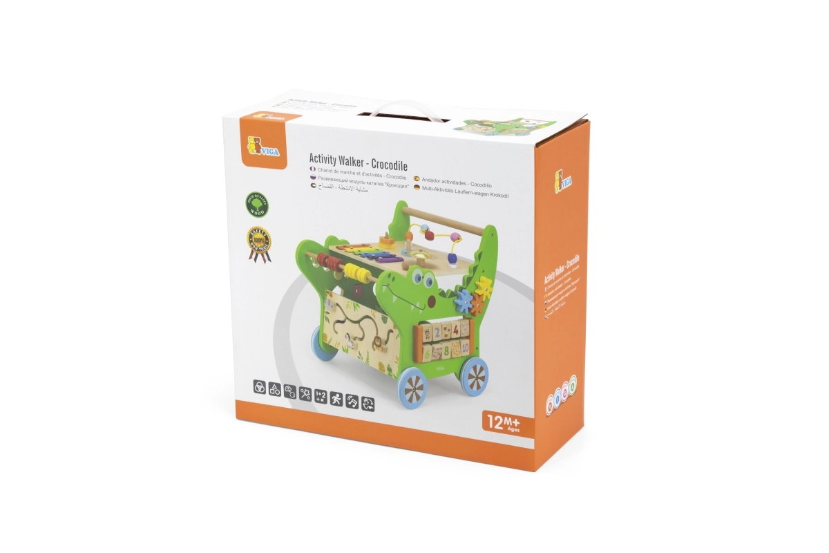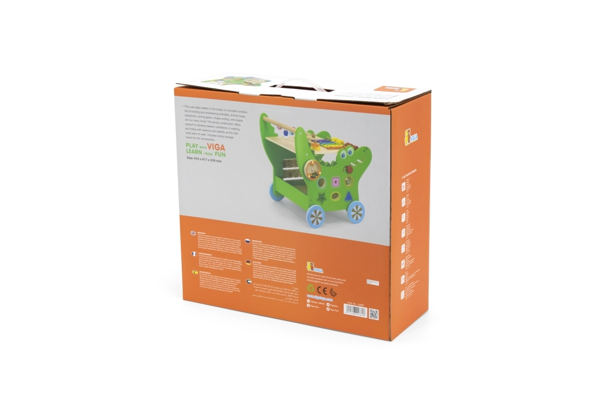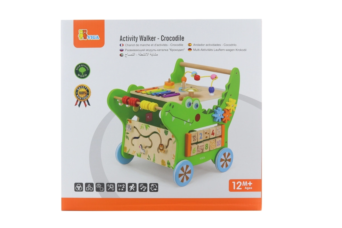 Puidust aktiivne kõndimisabi krokodill 12‑ühes VIGA on stabiilne abimees esimestele sammudele ning samal ajal rikkalik õppekeskus. Tugev konstruktsioon pakub kindlat tuge kõndimisel, samas kui mitmekesised tegevused arendavad meeli, motoorikat ja loovust. Tänu nutikale elementide paigutusele harjutavad lapsed värve, kujundeid ja esmast loendamist.