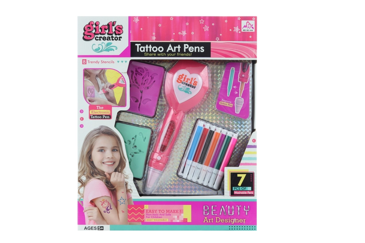 Selle lõbusa komplektiga loovad lapsed hõlpsalt stiilseid ajutisi tätoveeringuid. Tänu elektrilisele tätoveerimispastakale on pealekandmine lihtne ja kiire, šabloonid aitavad täpsete kujunditega ning 7 värvipastakat laiendavad loovusvõimalusi.