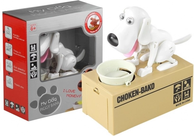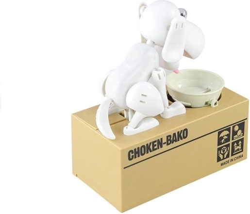See originaalne hoiukassa ühendab modernse disaini ja funktsionaalsuse. Suur kirstuke toimib mündimahutina, kaanel istub energiline valge koerake roosa keele ja musta ninakesega. Piisab mündi kaussi asetamisest ning vaadata, kuidas koerake selle elevusega „ära sööb“ – lapsed omandavad mänguliselt harjumuse säästa.