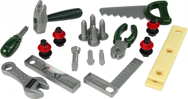 Sae, haamri, kruvikeeraja, mutrivõtme, tangide, kruvide, mutrite ja plaatidega – kõik, mida väike meister vajab peenmotoorika ja fantaasia harjutamiseks.