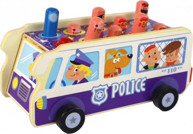 Lõbus puidust osavusmäng politseibussi kujul arendab peenmotoorikat, käe-silma koordineerimist ja kiireid reaktsioone. Lapsed „löögivad” haamriga üles hüppavaid tegelasi ning tänu ratastele saab bussiga ka sõita. Kvaliteetne puidust teostus, ohutud materjalid, CE-sertifikaat ja vastavus EN71 standardile tagavad muretu mängu.