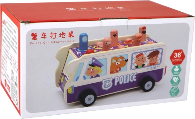 Massiivsest puidust politseibuss ühendab traditsioonilise „tagumismängu” ratastel sõitmisega. Lapsed tabavad haamritega üles tõusvaid pulki-tegelasi ning harjutavad täpsust, keskendumist ja tähelepanu. Vastupidav teostus ja mängulised illustratsioonid kutsuvad kordusmängule ja arendavad fantaasiat.