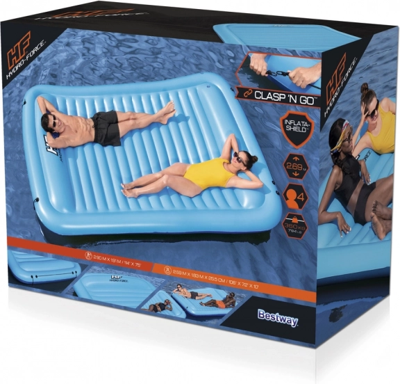 HYDRO-FORCE Sun Soaker ujuvsaar on suurepärane valik lõõgastuseks pere või sõpradega. Pärast täispumpamist mõõtmetega 269 × 183 × 25,5 cm mahutab see mugavalt kuni neli täiskasvanut, samas kui laiad nurkades olevad „padjad” tagavad rahuliku päikesevõtu ja stabiilse lamamise.