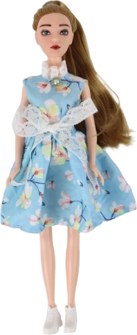 Nukk Emily (30 × 7 × 4 cm) on õrn kaaslane loovaks mänguks. Tal on tumeblondides toonides pikad kergesti kammitavad juuksed, rohelised silmad ja õrn meik realistliku ilme jaoks. Seljas on võluv sinine lillemustriga kleit pitsi, lipsukese ja kraega, mida täiendab väike „teemantlik“ detail kaelal ning valged kingakesed.