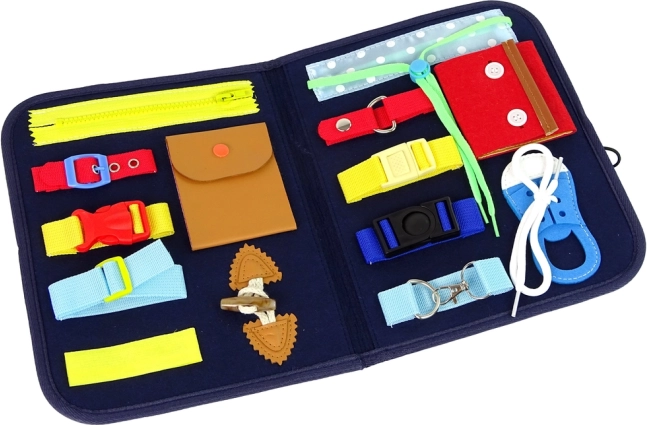 Tahvel sisaldab mitmesuguseid elemente erinevate kujude ja tekstuuridega, mis aitavad parandada taktiilset taju. See hõlmab erinevaid kinnitustüüpe, nagu nupud, pandlad ja paelutamine, mis ergutavad loovust ja õpetavad iseseisvalt igapäevaelu ülesannetega toime tulema.