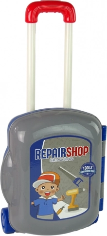 - Komplektis: avatav kohver/töölaud, kruustangid, punane lauatrell, käsitrell, kruvikeeraja, lehtvõti, haamer, saag, kirves, 3 kruvi, nagi, riiul, väike töölaud tööriistade asetamiseks ja kleepsud.