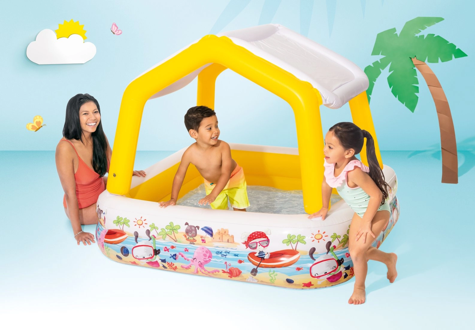 Komplektis on takjaga eemaldatav katus, mis pakub päikeseliste ilmadega mõnusat varju. Värvilised mereteemalised motiivid külgedel köidavad laste tähelepanu ja muudavad iga veemängu lõbusaks seikluseks. Tänu tühjendusventiilile on hooldus ja vee väljalaskmine kiire ja lihtne.