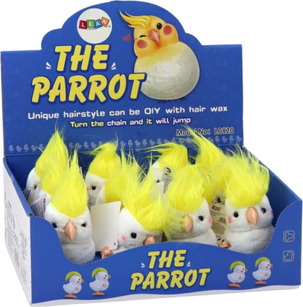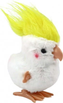 See keeratav plüüsist kakaduu paistab silma õrna valge karvkatte ja silmatorkava kollase tutiga. Sobib hästi pisikingituseks, riiulikaunistuseks ja igapäevaseks mängukaaslaseks. Pärast mehhanismi kerimist hüppab papagoi rõõmsalt ja käivitab lõbu juba mõne sekundiga.