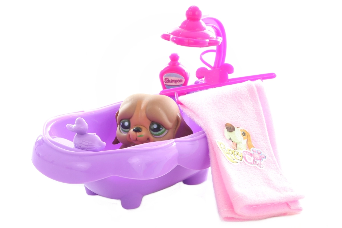 Vann dušiga, rätik ja „šampoon“ võimaldavad lastel läbi mängida igapäevast lemmiku hooldust ning arendada empaatiat ja peenmotoorikat.