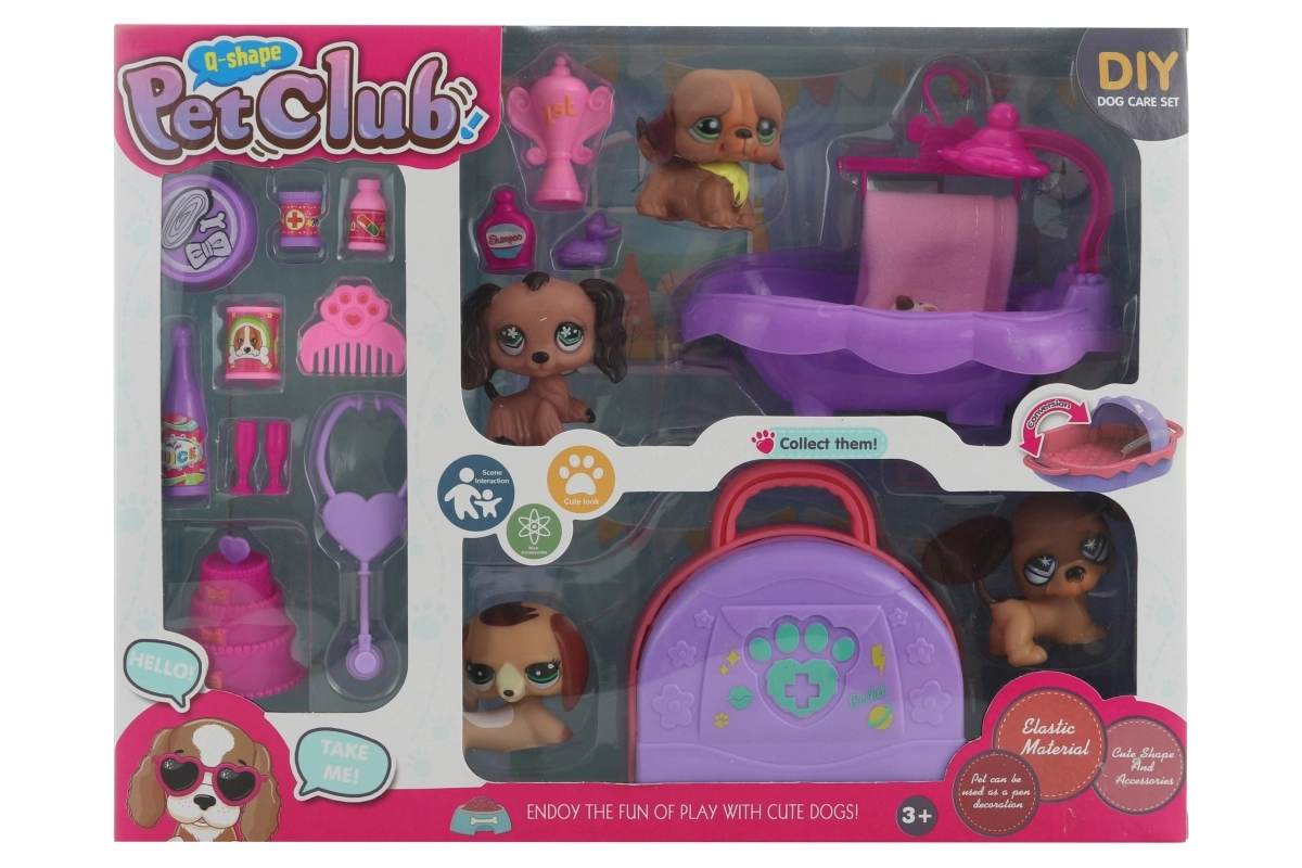 See värvikas koertekomplekt tarvikutega muudab lastetoa väikeseks ilusalongiks ja loomahoolduse kohaks. Lapsed saavad oma koeri vannitada, kuivatada rätikuga, toita ja panna nad puhkama pehmesse pessa, mis on peidetud praktilisse kohvrisse. Kõik on valmistatud vastupidavast plastist ja kohandatud väikestele laste kätele.
