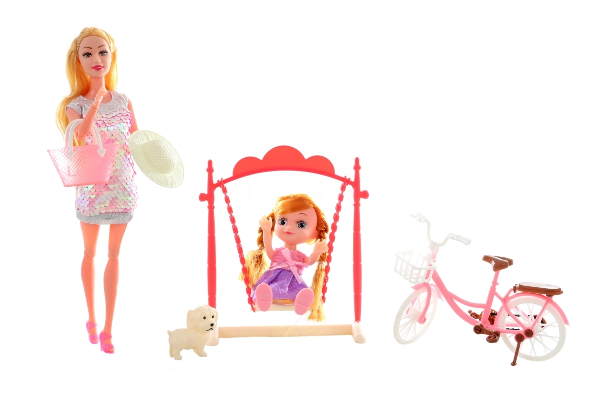 Komplekti kuuluvad auto, mopeed ja jalgratas dünaamilisteks sõitudeks, kiik hetkedeks puhkuseks ning armas koerake kui truu kaaslane. Lapsed võivad vahetada rõivaid ja tarvikuid, planeerida väljasõite ja luua oma lugusid.
