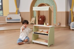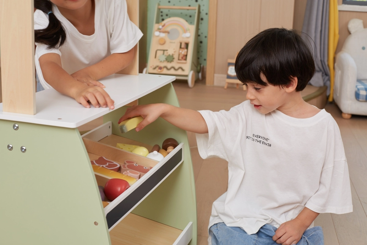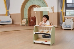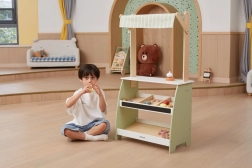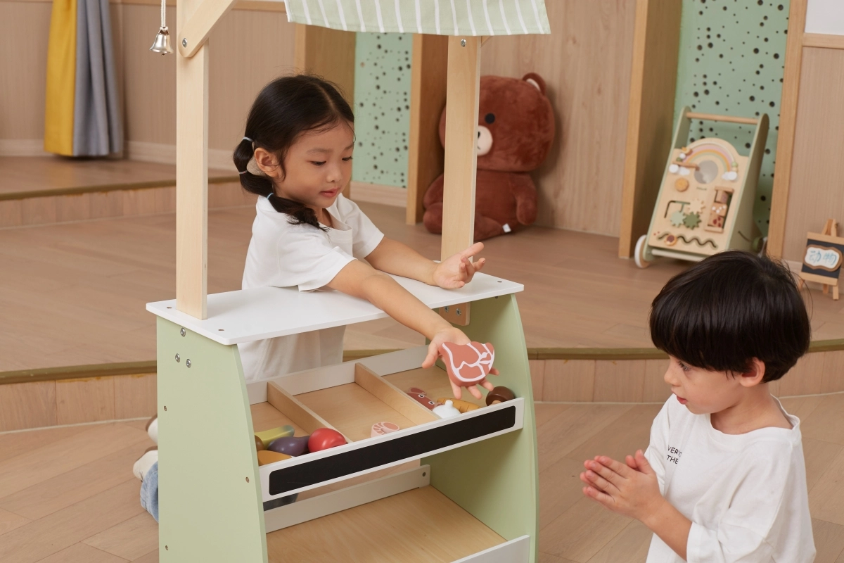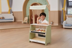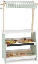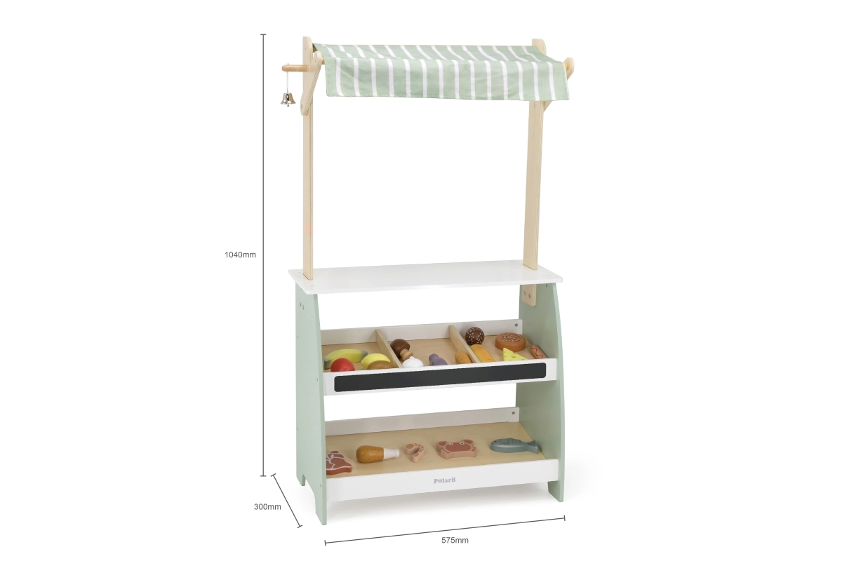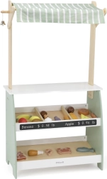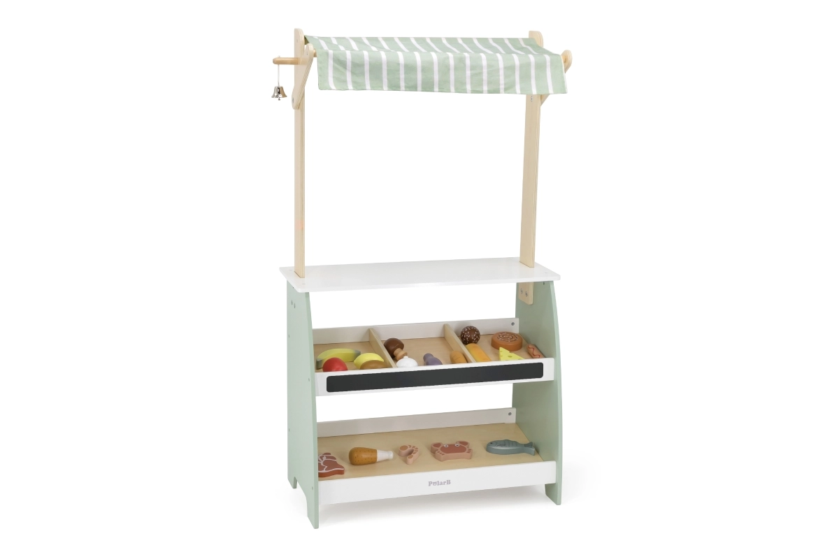 Puidust stend pakub rohkelt ruumi eri tüüpi mänguasjadele, sobides suurepäraselt poe- või turumängudeks.