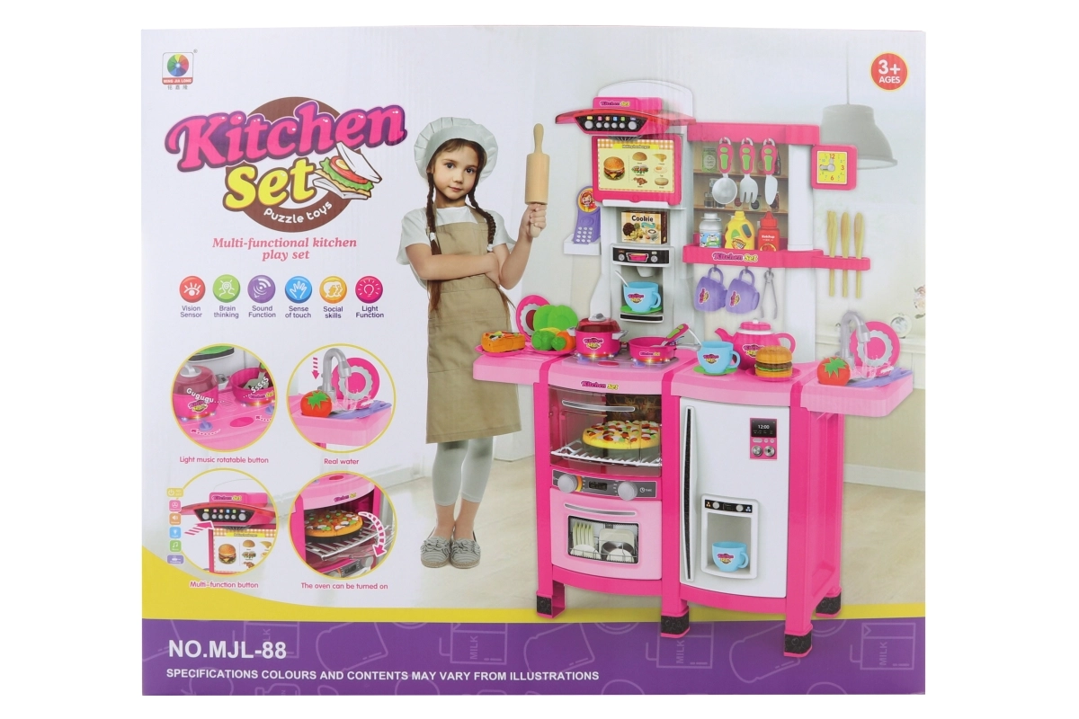 See plastist köök on varustatud pliidi, nõudepesumasina, kraanikausi, ahju ja külmkapiga, muutes selle loovatele lastele ideaalseks mänguasjaks. Köögist leiavad väikesed kokad ka plastnõud, toiduained ja mängutoidu, mis ergutavad nende fantaasiat.