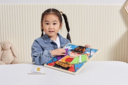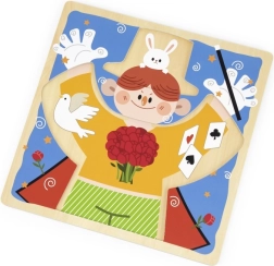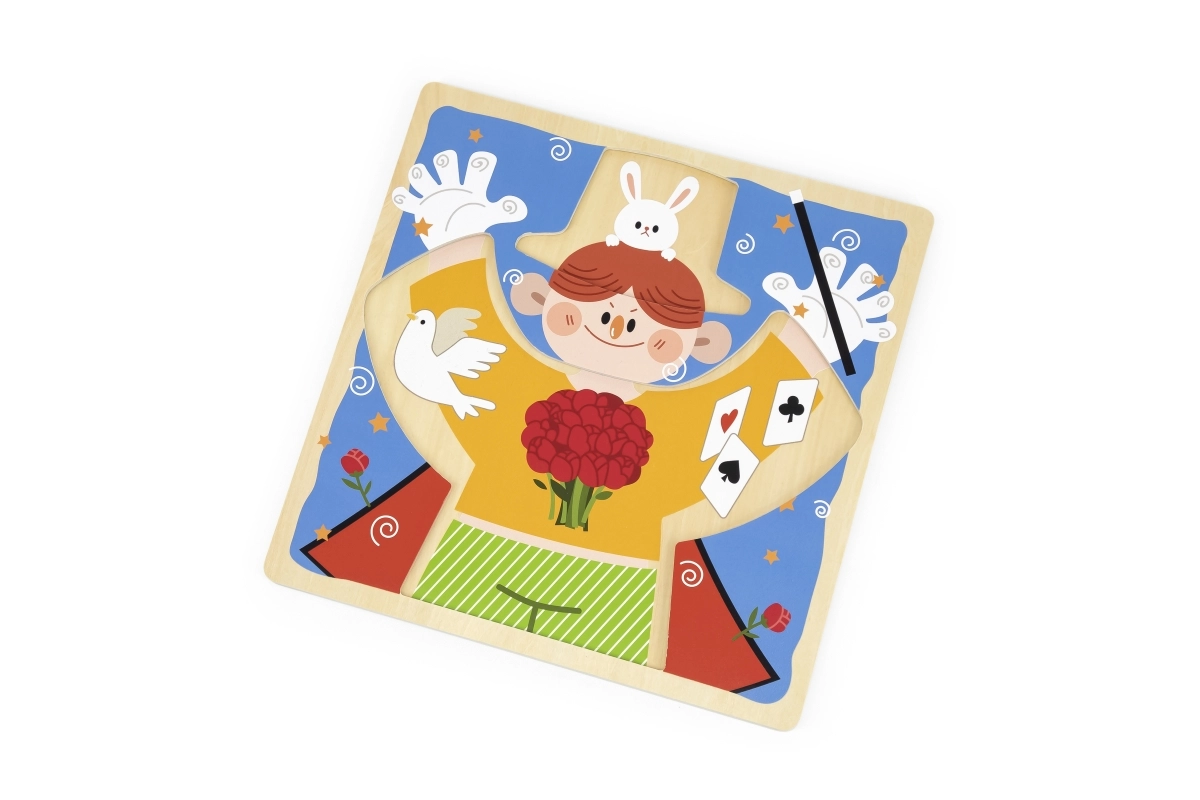 Üksikute riideosade all peituvad teemakohased motiivid (jänku, kaardid, tuvi, lillekimp), mis laiendavad mängu lihtsate mälumängude ja loojutustamisega. Tahvel on inspireeritud Montessori põhimõtetest – ergutab uudishimu, toetab keskendumist ja tugevdab lapse enesekindlust.