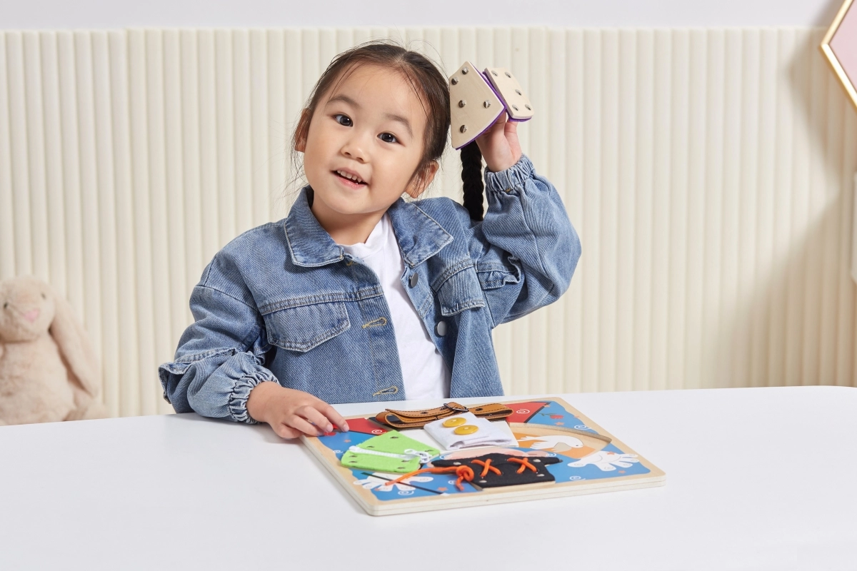 Võluriga tegevustahvel on ideaalne abivahend esimesteks sammudeks iseseisva riietumise suunas. Lapsed saavad turvaliselt proovida eri kinnitustüüpe – tõmblukust ja nööpimisest kuni trukkide, pandlate ja paelte läbipõimimiseni. Puidust alus ja tekstiilsete detailidega elemendid teevad mängu meeldivaks katsuda ning kutsuvad korduvaks harjutamiseks.