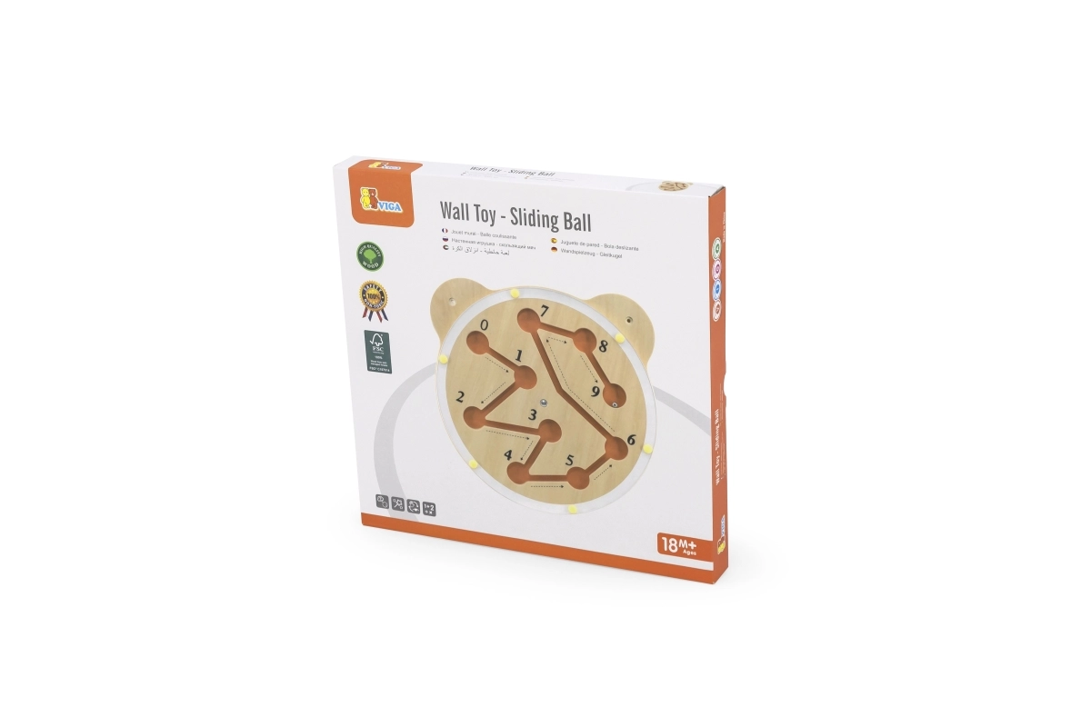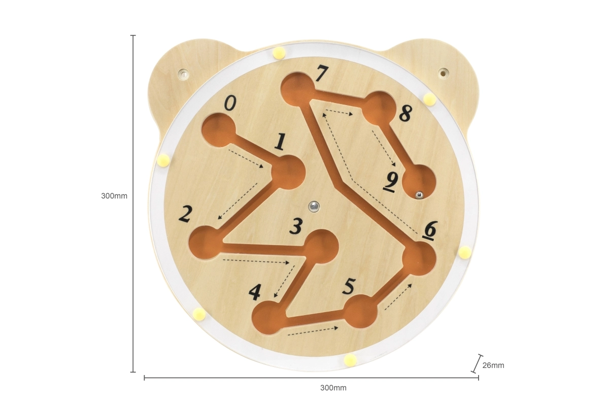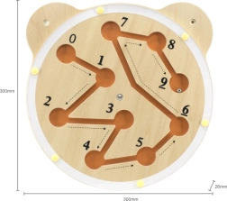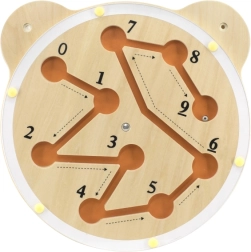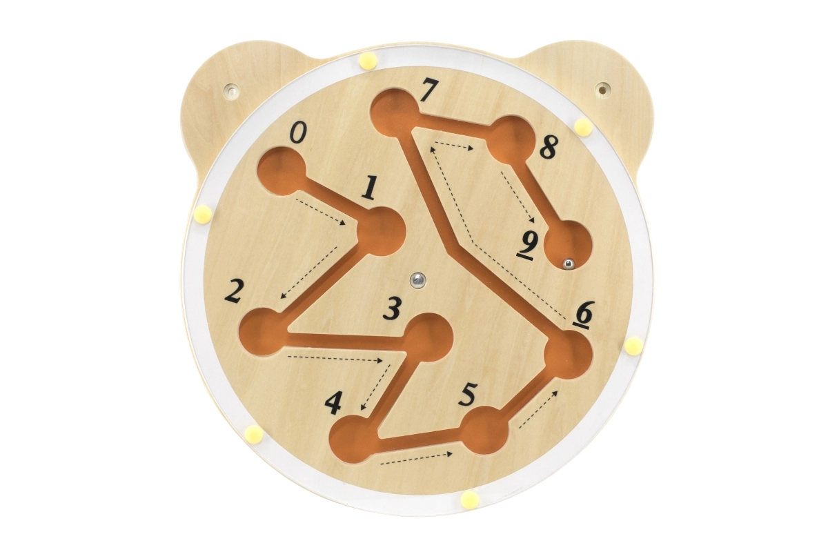 See Viga seinapealne õppetahvel toreda karu pea kujul ühendab mängu ja õppimise. Pööratava plaadiga juhite teraskuuli mööda soonekesi nii, et see jõuaks järjest iga numbrini 0-st 9-ni. Lapsed harjutavad loomulikult lugemist, kannatlikkust ja probleemilahendust.