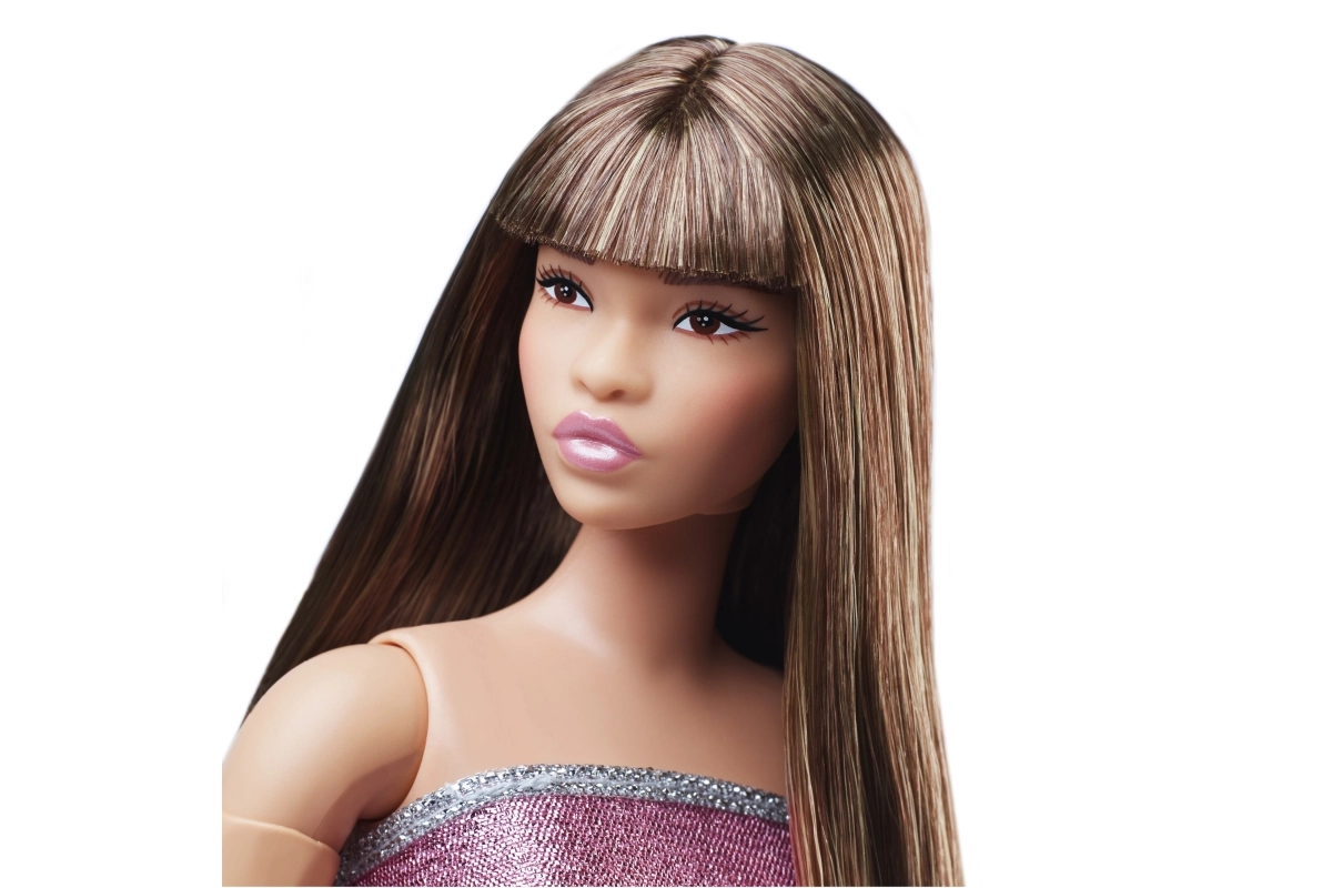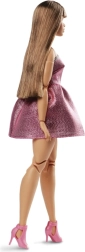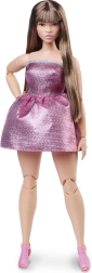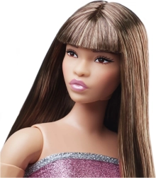 Barbie nukul on siledad pruunid juuksed sirge tuka, väljendusrikkad kulmud ja särav meik, mis täiendab tema välimust.