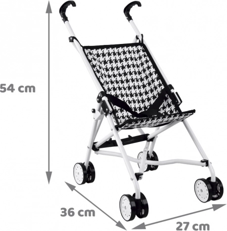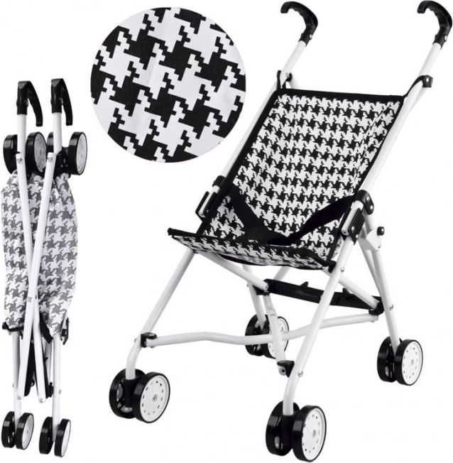 Avastage loova mängu parim kaaslane – kokkupandav nukukäru mustvalge pepito-mustriga. Tugev metallraam, mugavad käepidemed ja turvarihm hoiavad nuku kindlalt paigal ning laps saab sõitu nautida pingutuseta. Tänu kompaktsetele mõõtudele on käru lihtne kanda ja hoiustada.