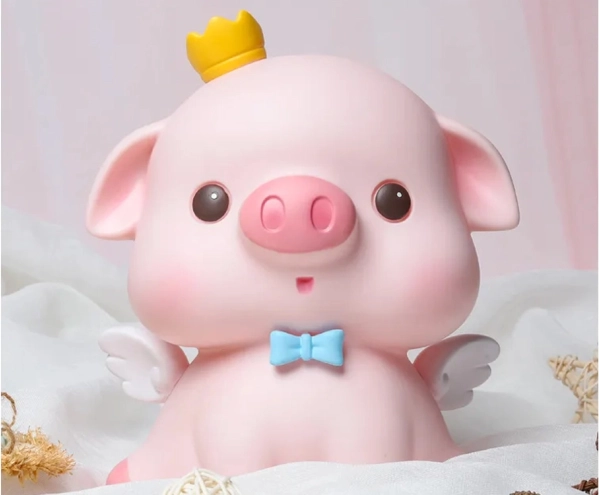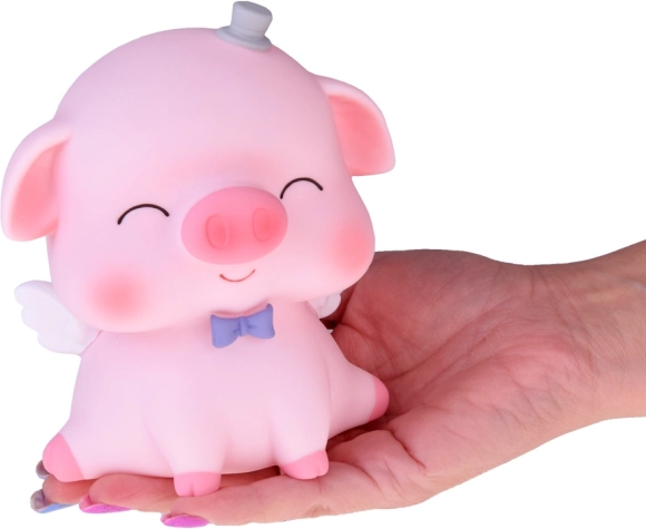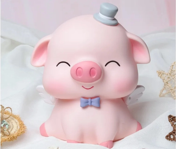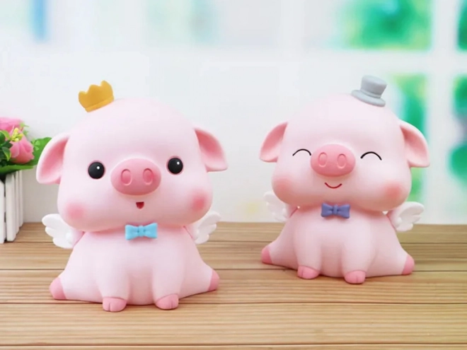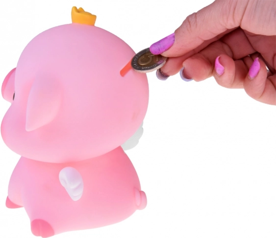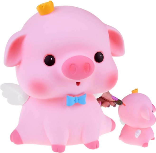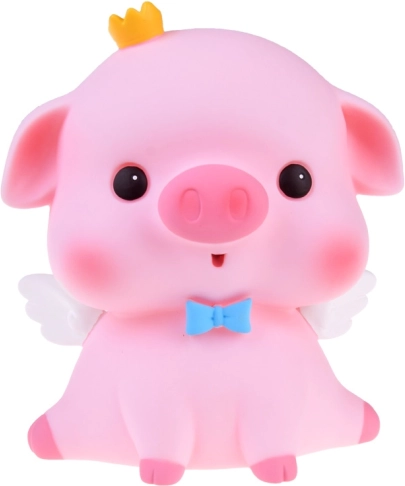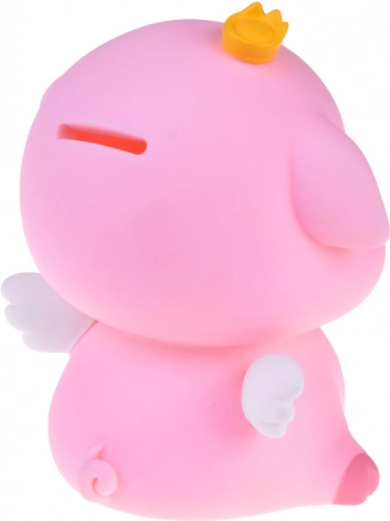 See võluv roosa põrsakujuline hoiukassa valgete tiibade, sinise kikilipsu ja kollase krooniga ühendab praktilisuse ja rõõmu. See võimaldab hoiustada kõiki tavalisi münte ja kokkuvolditud paberraha ning muudab interjööri hubasemaks. Ideaalne lastele, kes õpivad raha väärtust, ja täiskasvanutele, kes soovivad hoida väikesed säästud kenasti ühes kohas.
