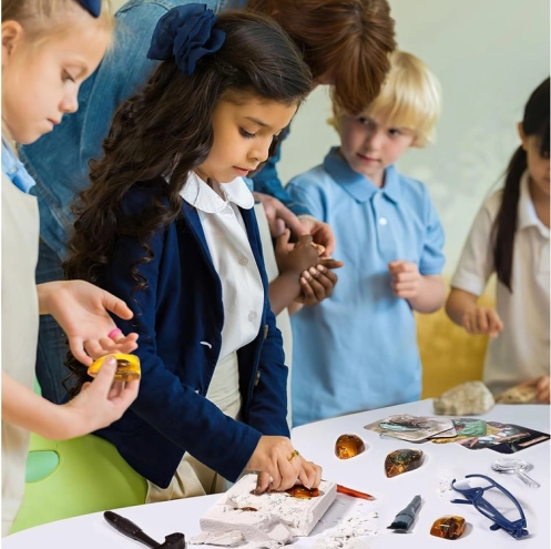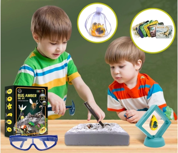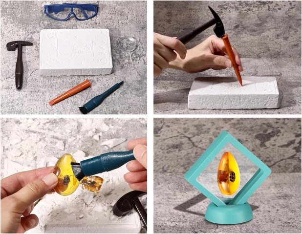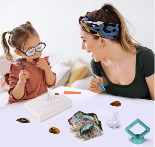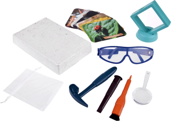 Muutke lastetuba väikeseks paleontoloogia tööalaks. Kipsvalus on peidus 6 „merevaigutükki” sisse kapseldatud putukatega, mille laps avastab samm-sammult haamri, peitli ja pintsli abil. Turvalisuse tagavad kaitseprillid, detailseks uurimiseks on luup.