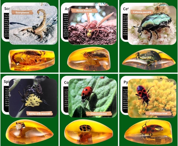 Puhastatud leiud saab panna fossiilikotti või eksponeerida esitusalusel. Kaasas on ka infokaardid inglise keeles putukate piltidega – suurepärane viis ühendada mäng loodusõpetuse põhiteadmistega ja võõrkeeleõppega.