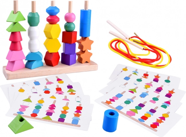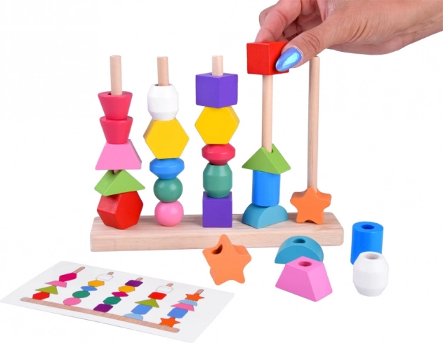 See mitmekülgne puidust mänguasi pakub kahte mänguviisi: värviliste helmeste nöörile lükkamist ja kujundite asetamist viie tapiga alusele vastavalt näidistele. Tänu erksatele värvidele ja mitmekesistele geomeetrilistele kujunditele toetab see loomulikult nägemis-, kompamis- ja ruumitaju arengut.