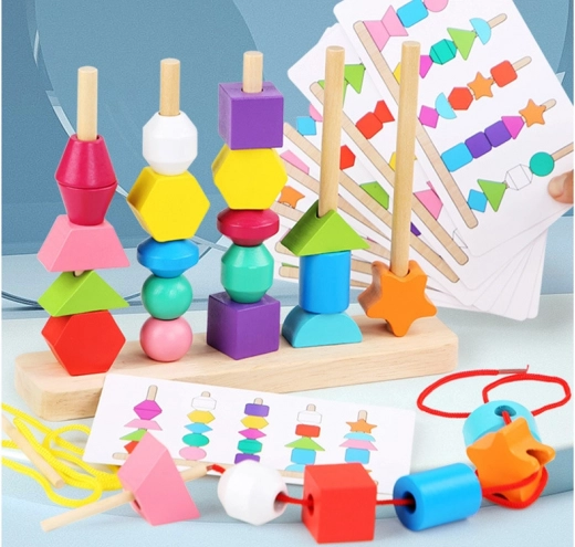 Lükake helmeid nöörile või laduge need tappidele etteantud näidiste järgi. Lapsed valivad, mis neid köidab – samal ajal harjutades motoorikat ja keskendumist.