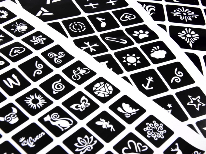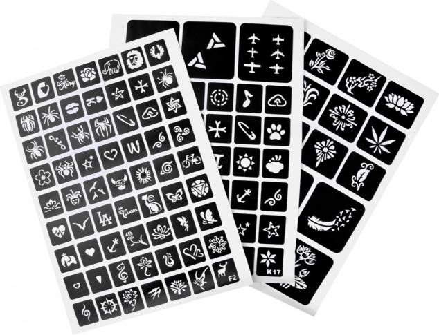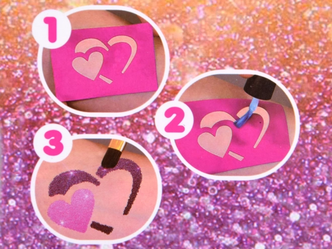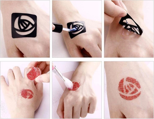 Juhend: Vali šabloon ja aseta see puhtale nahale, kanna muster liimiga, eemalda šabloon, lisa sädelevärvid – ja valmis!