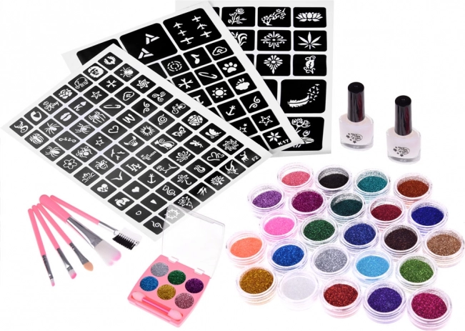 Selle sädelevate tätoveeringute komplektiga saad koheselt luua imelisi sädelevaid tätoveeringuid. Komplektis on 120 erinevas suuruses šablooni, 24 purgikest kaunite sädelevärvidega ja 2 pudelit liimi – sellest jätkub paljudeks tätoveeringuteks. Kaasas on ka sädelevad lauvärvid ja pintslite komplekt täiusliku stiilse tulemuse saavutamiseks.