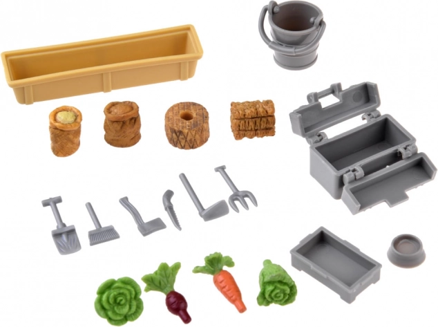 Laudahoone, majandushooned, tuuleveski, lambid, aiad ja söödakünad. Puuduvad ei ole ka tööriistad, viljakotid, pakkematerjalid ja köögiviljad täieliku farmimaailma loomiseks.