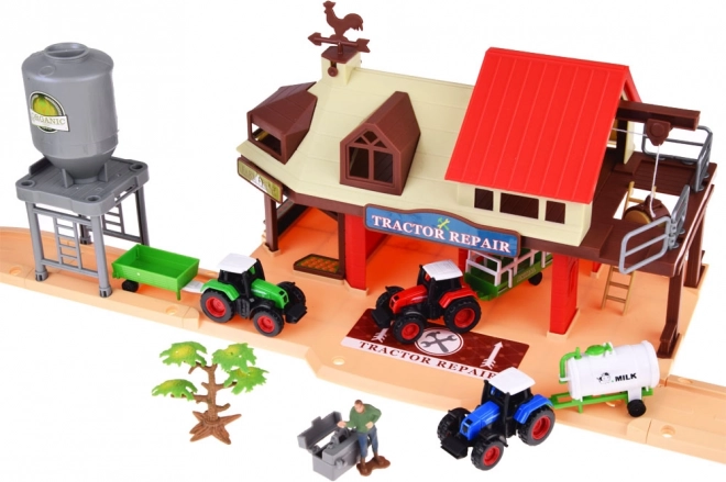 Komplektis on kolm värvilist traktorit (punane, sinine, roheline) koos piimatsisterni, kallutatava kastiga haagise ja heina või teravilja veoks mõeldud käruga – ideaalne realistlikuks mänguks.