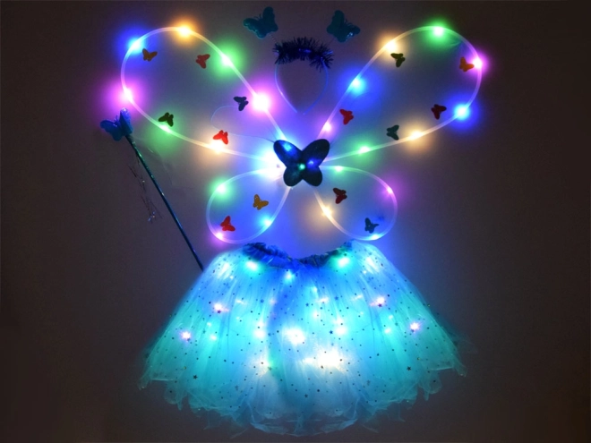 See imeline haldjakostüüm sinises värvitoonis toob rõõmu igale väikesele tüdrukule. Komplektis on LED-tulukestega seelik, tiivad, peapael ja võlukepp, pakkudes muinasjutulist elamust igaks puhuks.