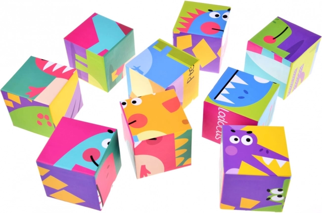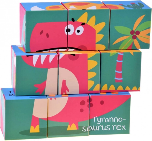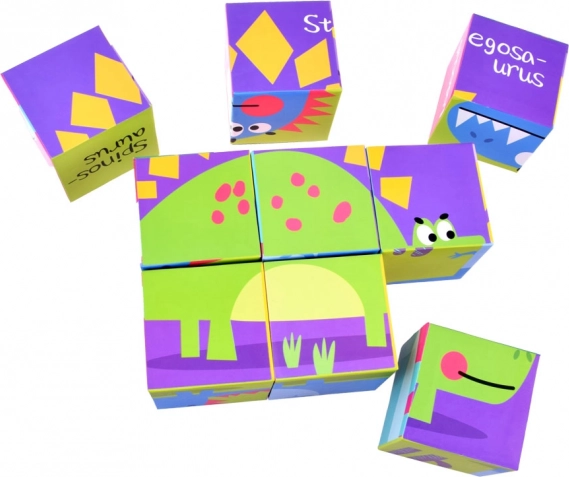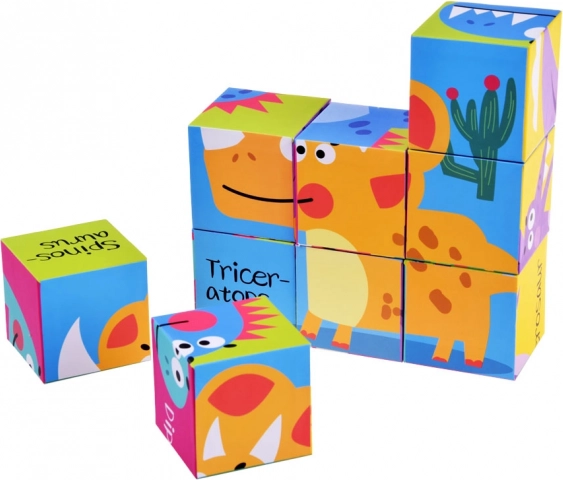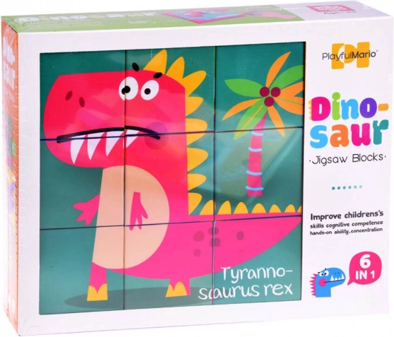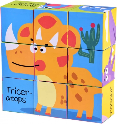 Üheksa kuubikut võimaldavad kokku panna kuus erinevat dinosauruste pilti, kasutades värvikaid illustratsioone lihtsaks õppimiseks.
