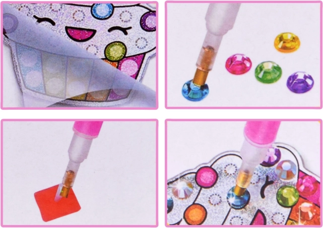 See komplekt võimaldab luua 12 imelist kleebist säravate teemantkivikeste abil. Piisab, kui valida õige värv ja paigutada tükid spetsiaalse aplikaatori abil kleepšabloonile. Tulemuseks on kaunis ja värvikas kaunistus.