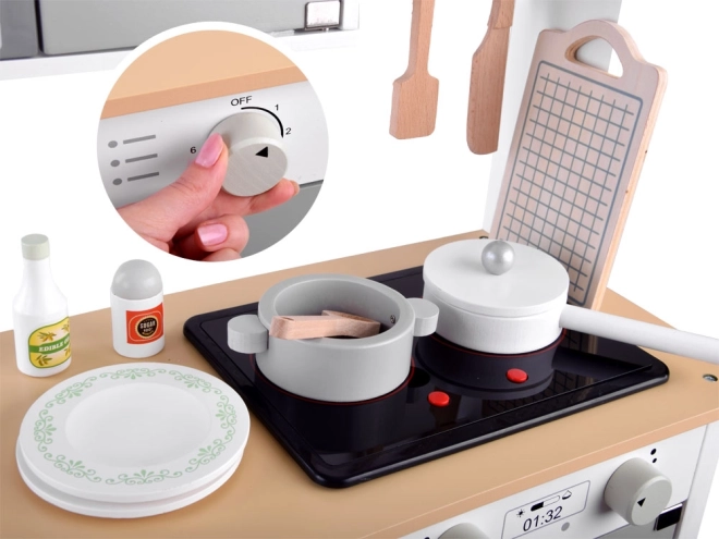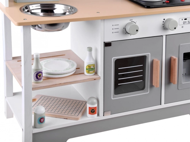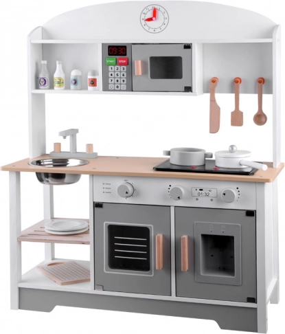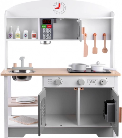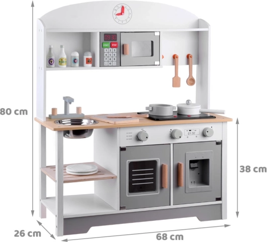 See lastesõbralik köök on esteetiliselt viimistletud ning pakub lisaks suurepärasele meelelahutusele ka lapse arengut toetavaid võimalusi. Lapsed armastavad täiskasvanuid matkida ning see köök võimaldab mängida kokkamist, koristamist ja muid majapidamisega seotud tegevusi.