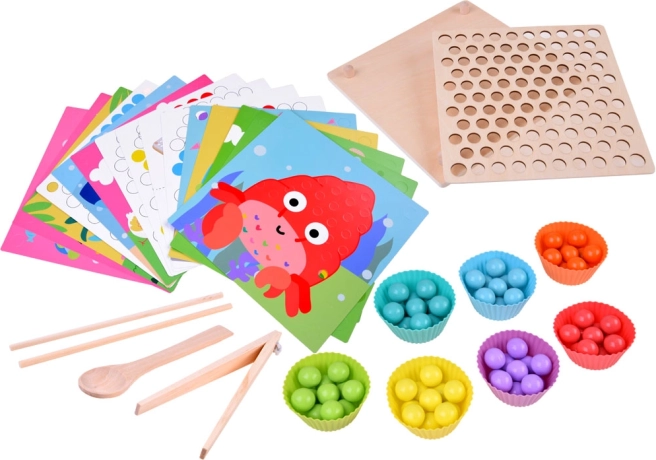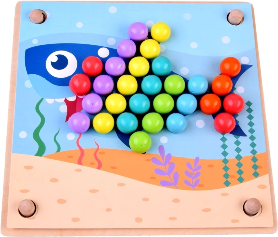 See puidust mosaiik sisaldab 77 värvilist kuulikest 7 värvis, kaheastmelist puidust alust ning rikkalikku tarvikute komplekti, sh silikoonkausid, pintsetid, pulgad ja lusika. Lapsed saavad kokku panna motiive 10 temaatilisest šabloonist (nt krabi, kaheksajalg, hai, raid, vaal, kukk, lammas, lehm, dinosaurus, buss) ja 5 mustrišabloonist – või luua täiesti oma fantaasia järgi.
