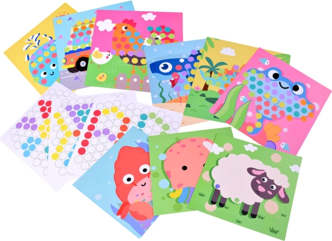 Komplektis on 10 pildilist šablooni ja 5 mustrilehte. Lapsed saavad kokku panna loomakesi ja sõidukeid või luua oma mosaiike.