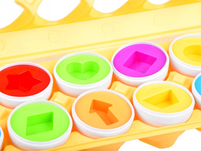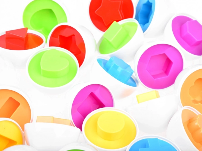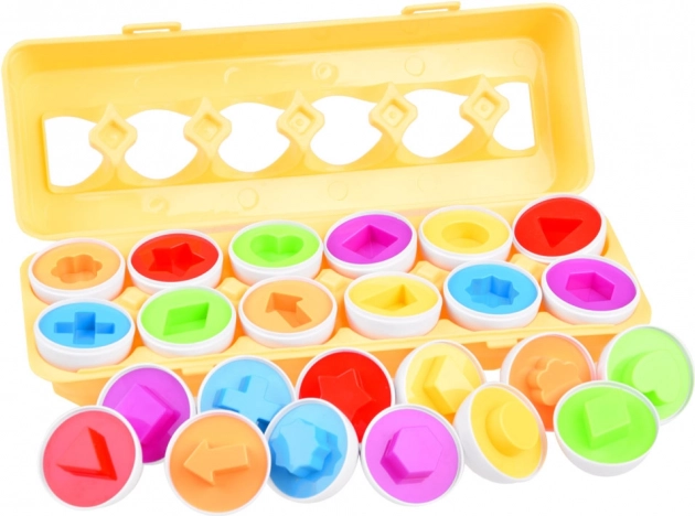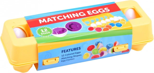 See nutikas komplekt sisaldab 12 valget muna, mis on peidetud kollasesse plastalusesse. Seest leiavad lapsed erivärvilised poolikud kujunditega, mis tuleb õigesti sobitada nii värvi kui ka kuju järgi (nt täht, süda, ring, ruut ja teised). Mäng toetab varajaste oskuste arengut, õpetab kannatlikkust ja keskendumist.